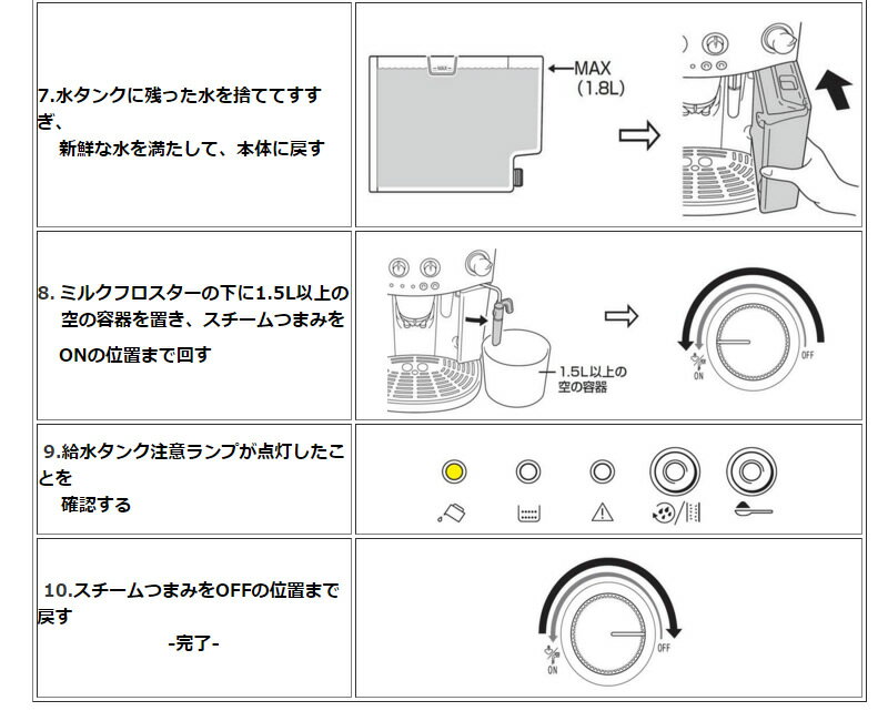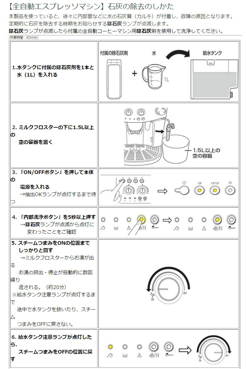 ■コーヒーマシンの除石灰ランプや警告メッセージが表示された場合、本除石灰剤1本(100mL)と水(1L)を給水タンクに入れ、使用手順に従い石灰分を除去します。
