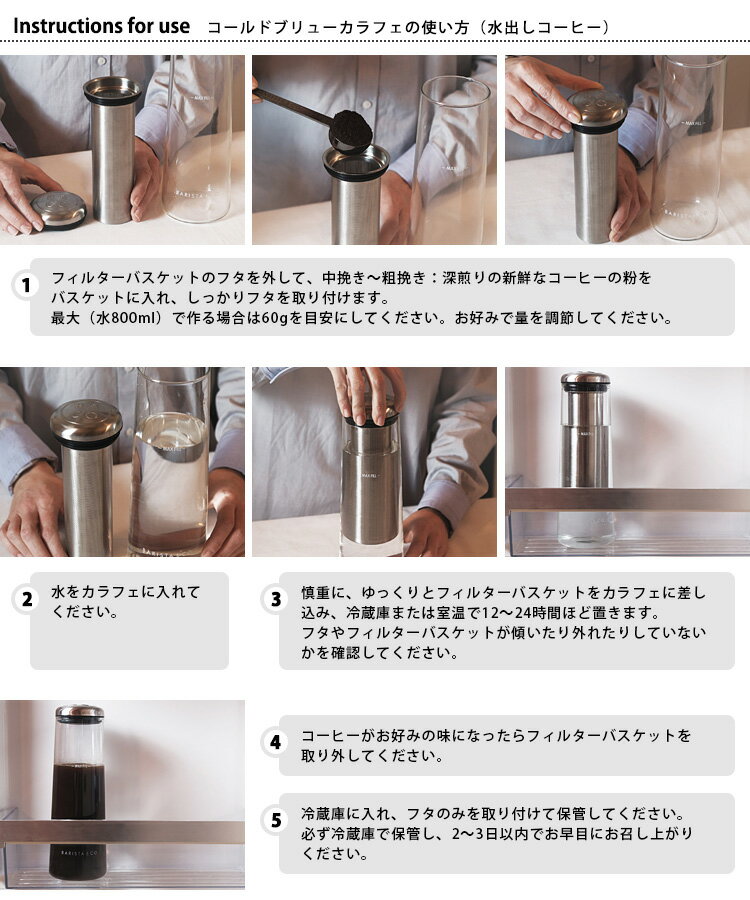 BARISTA&CO コールドブリューカラフェ じっくり時間をかけて作るスッキリとした味わいの水出しコーヒー じっくり時間をかけて作るスッキリとした味わいの水出しコーヒー 水に浸し、長時間ゆっくりと抽出・ろ過したコーヒーは、独特の滑らかで甘い味を作り出します。